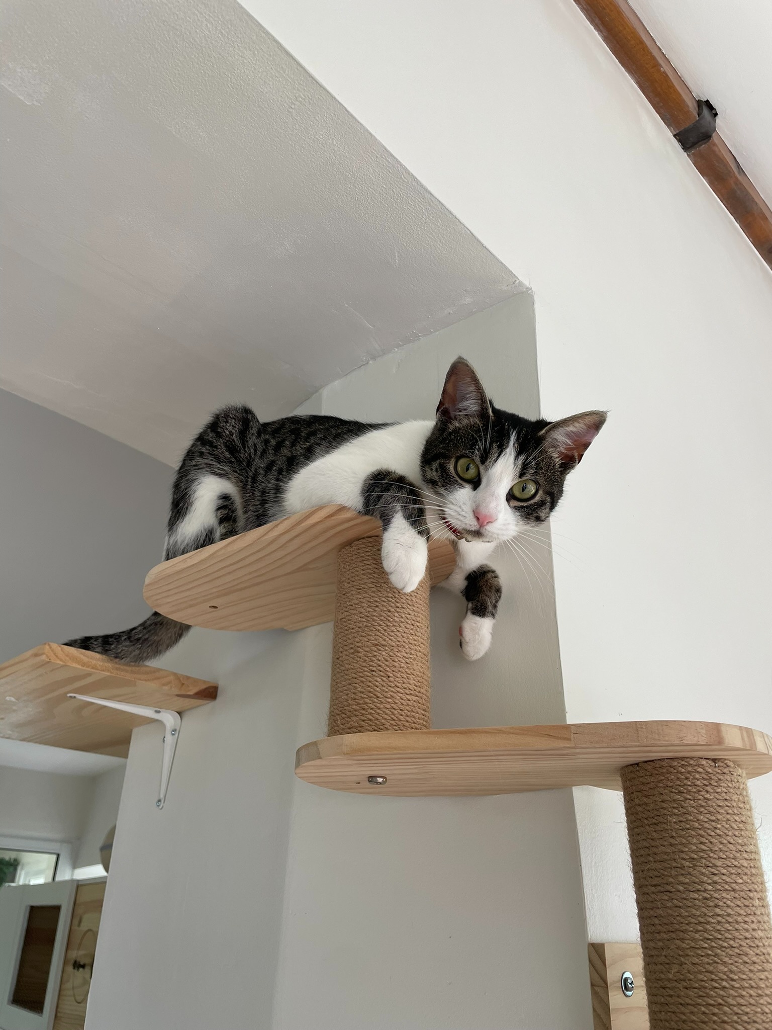 Espace de jeux muraux, coussins moelleux, fontaine à eau et croquettes à volonté